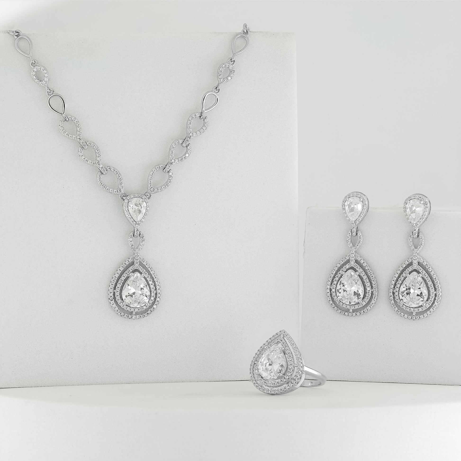- Necklace: Featuring a flowing design of interlinked pavé teardrop loops leading to a pear-cut central pendant framed by double halos of pavé stones, creating depth, symmetry, and regal luminosity.