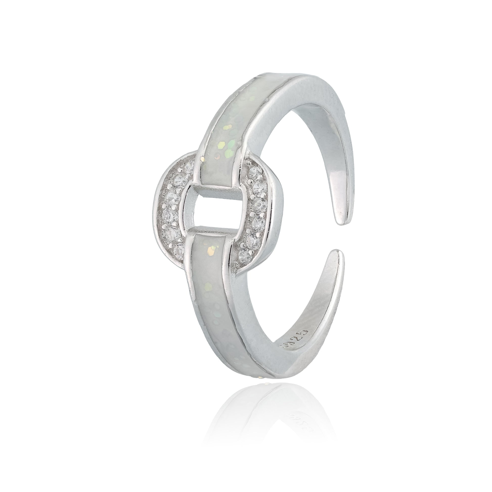 This ring features a bold central link motif, accentuated with a border of shimmering crystals. The band’s sleek, polished surface adds to its refined yet versatile appeal perfect for both everyday wear and elevated occasions.