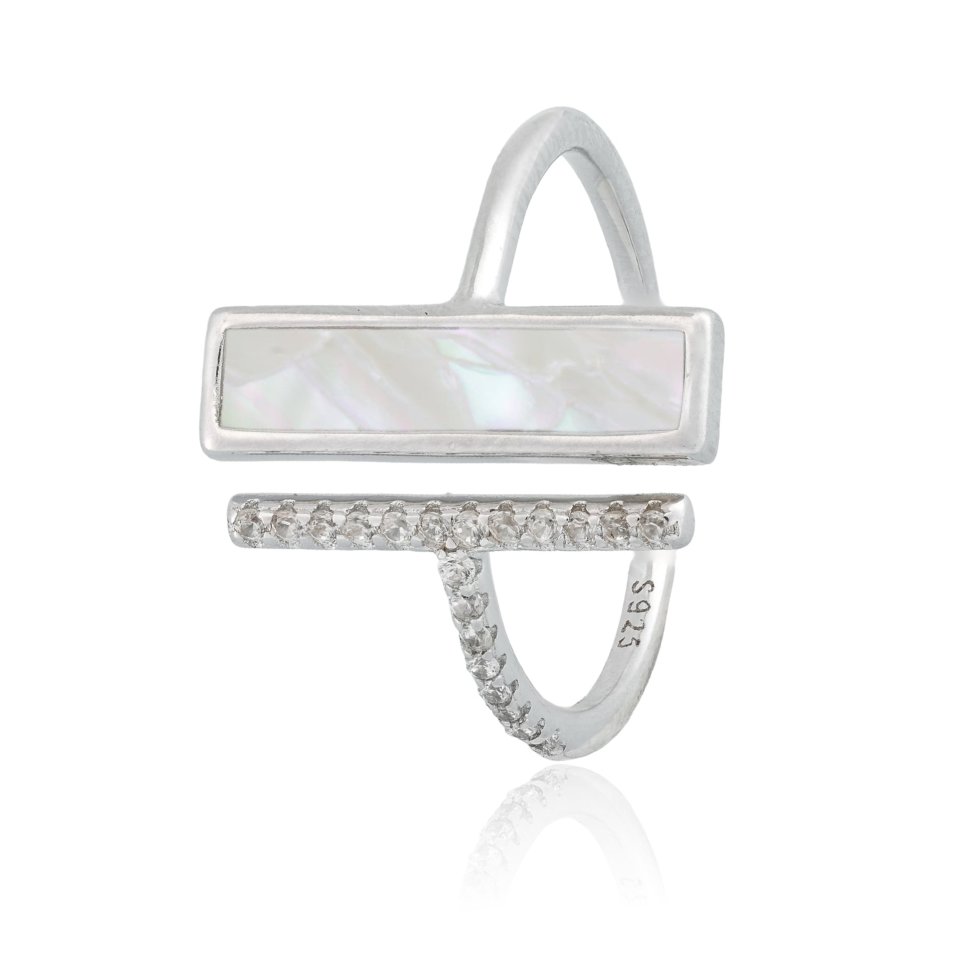 This contemporary open ring features a horizontal crystal-studded bar set opposite a lustrous rectangular panel of natural shell. The dual-bar silhouette reflects a perfect intersection of light and texture—minimal yet impactful.