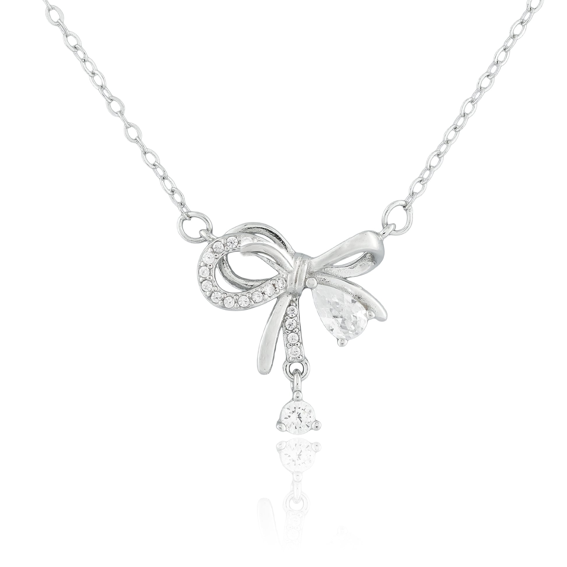 This refined piece features a sculpted bow pendant adorned with fine crystals, symbolizing elegance and gentle strength. A teardrop-shaped crystal nestles beside the bow, complemented by a single dangling charm that adds a hint of playful movement. Suspended from a dainty silver-tone chain, the design is both soft and statement-worthy.
