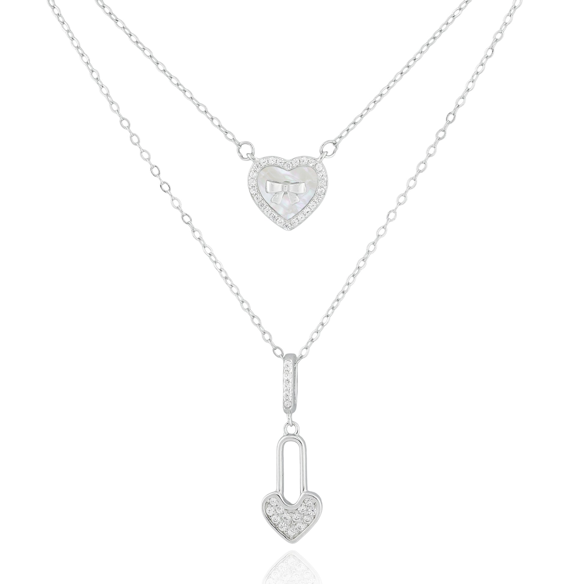 - Bow-Heart Necklace: A polished heart pendant with a shimmering mother-of-pearl inlay, crowned by a dainty silver bow and outlined with micro-crystals. It evokes the feeling of a wrapped gift perfect for someone cherished.
