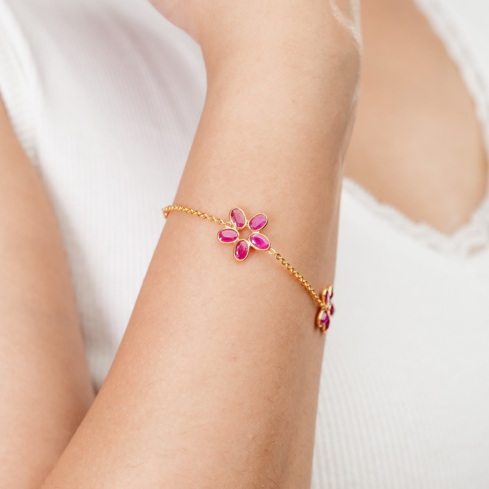 Net Qty: 1 Floral Bracelet featuring 15 Natural Purplish-Red Rubies arranged in 3 Flower Clusters (5 stones per flower) with Gold Plating