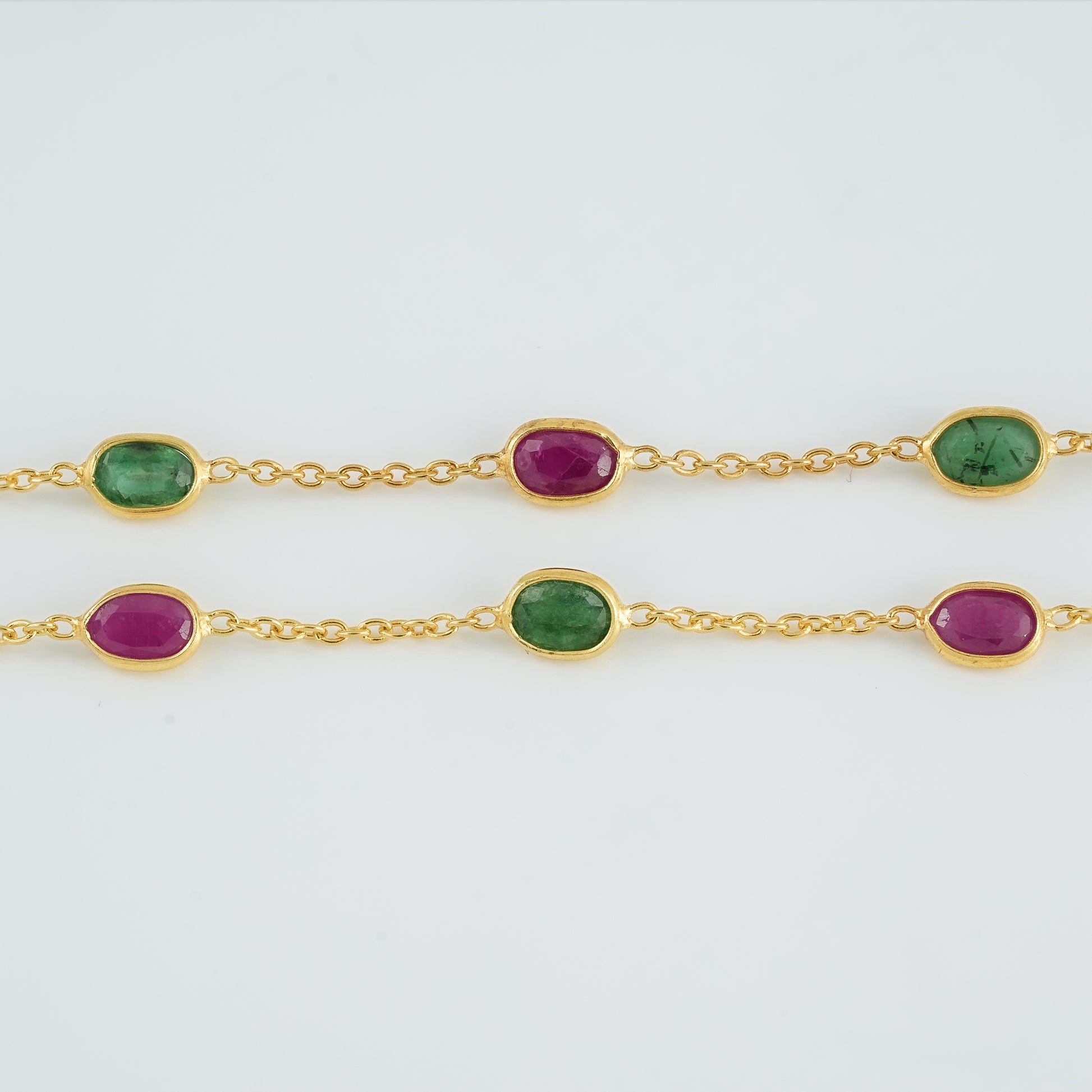 • Layer 1 (Top): 6 natural precious stones - 3 rubies and 3 emeralds in alternating oval cuts (7mm x 5mm) with sophisticated 0.6-inch spacing
